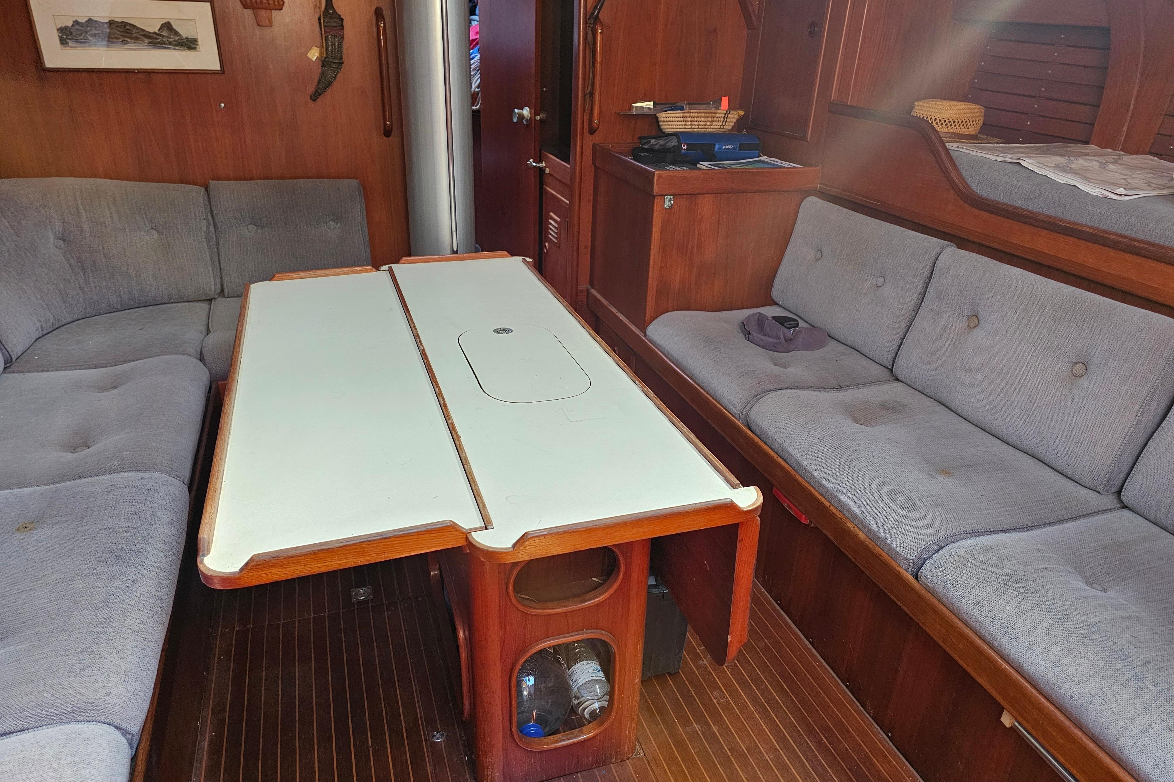 ? Two pilot berths, two settee berths, custom drop leaf table,