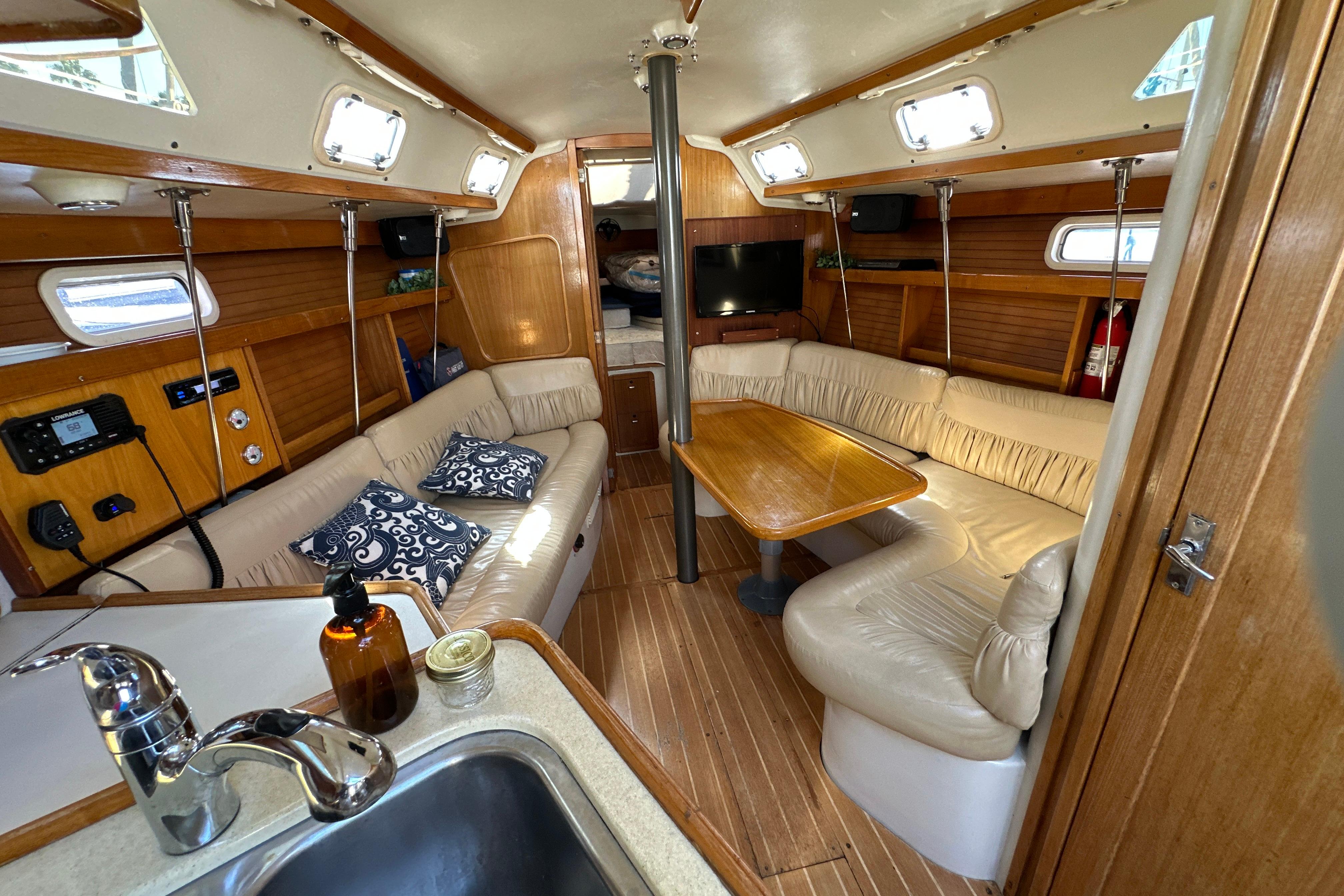 between the aft cabin and the dinette, and the galley is across to port, with the nav