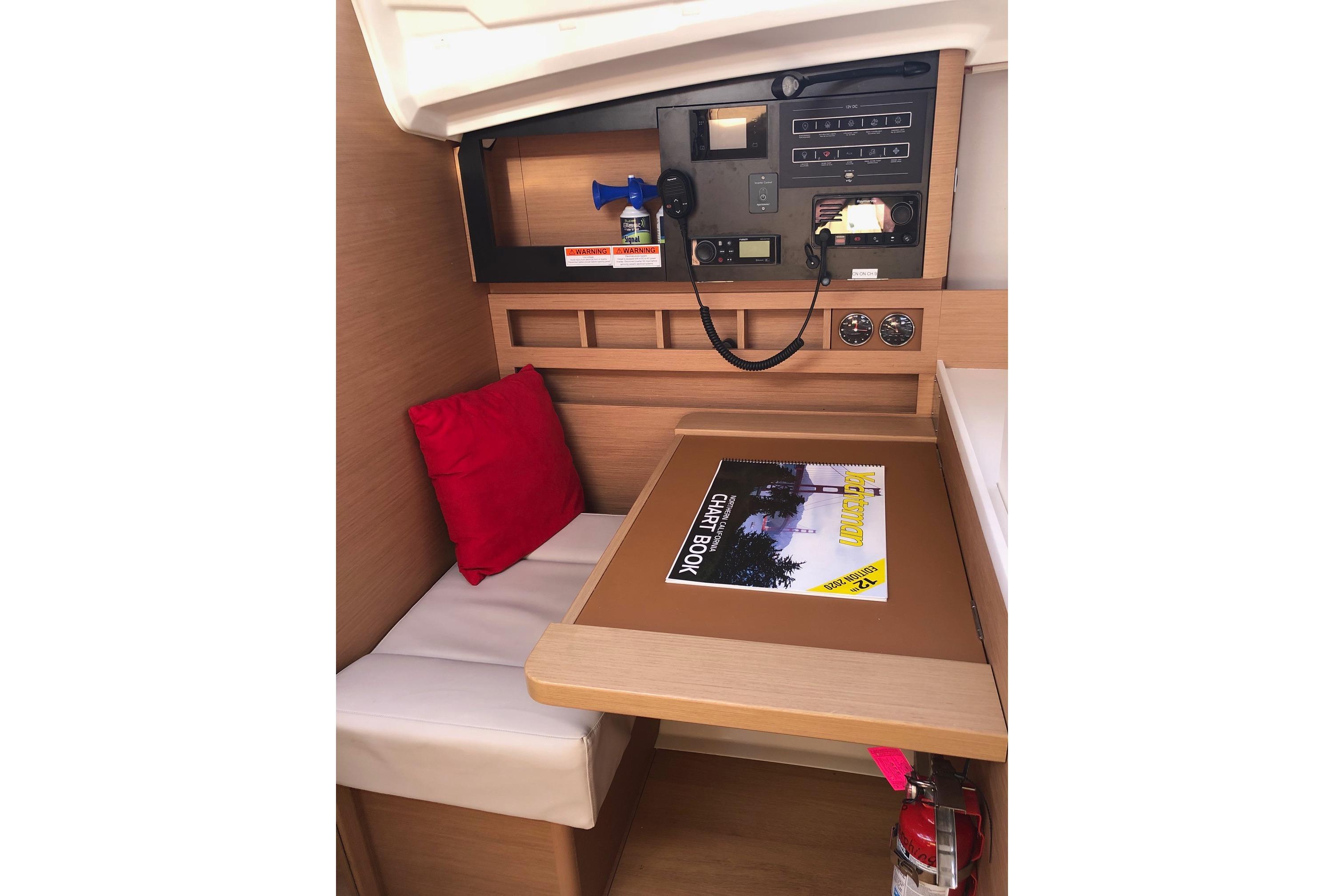 Starboard of the companionway is comfortable head with step in shower area. Moving aft port and starboard are comfortable double berth staterooms with hanging lockers. Port of companionway is very comfortable inline seated Nav Station with storage and electronics at your finger tips.