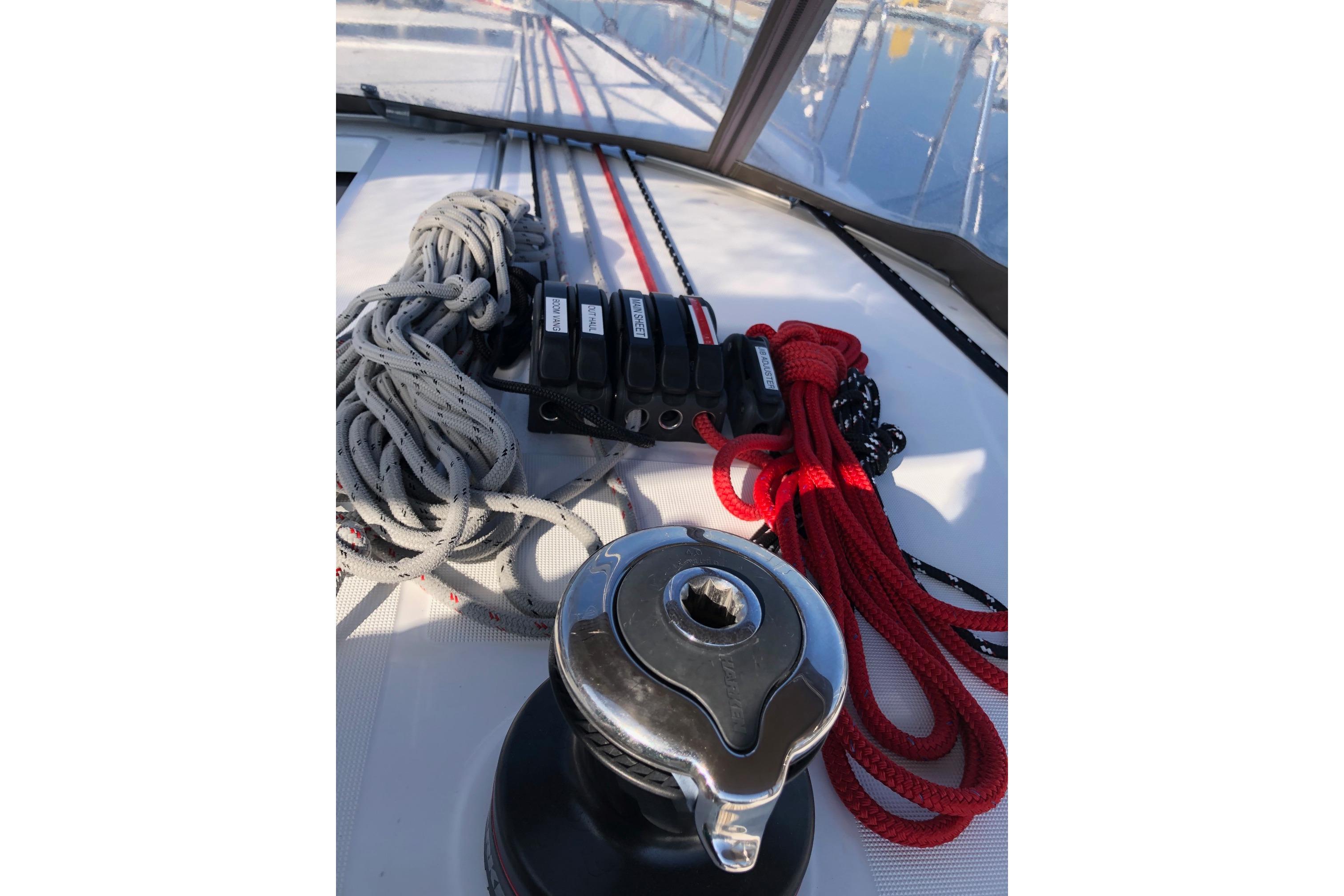 Double spreader, fractional rig with all lines leading aft to cockpit winches.
