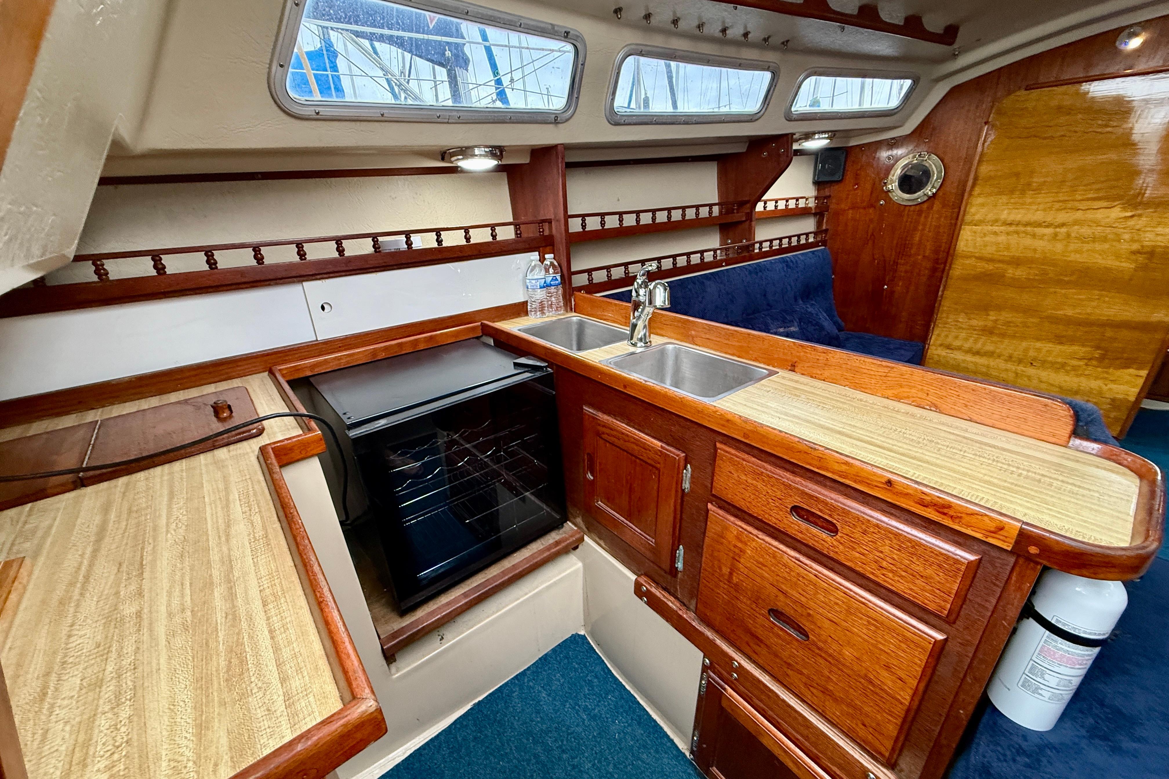 Full galley with sink, and 1 Top Loading Refrigerator & Wine Cooler