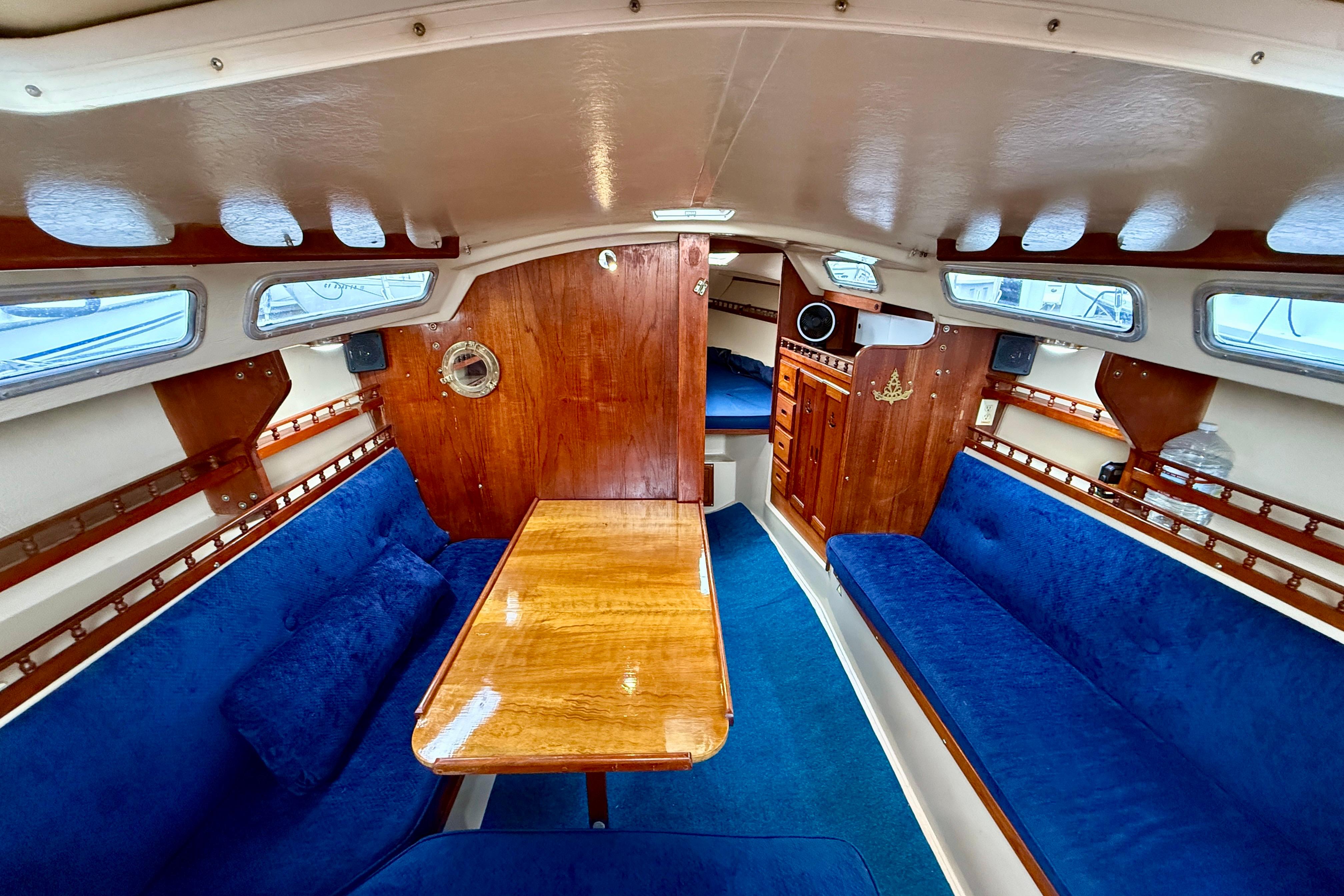 Step below and you’ll immediately notice the care this boat has received. The newly varnished teak gives the interior a warm, classic feel, while the recently reupholstered cushions provide modern comfort.
